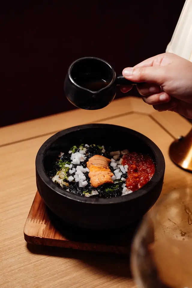主菜先有Honjokko主廚 Kyle 特別炮製嘅韓式海膽石鍋飯,一口感受韓日fusion。另外韓式醬油煎鱸魚滑溜到不得了☺️醬汁用上蛋黃醬製成配搭炸泡菜酸酸甜甜幾特別。