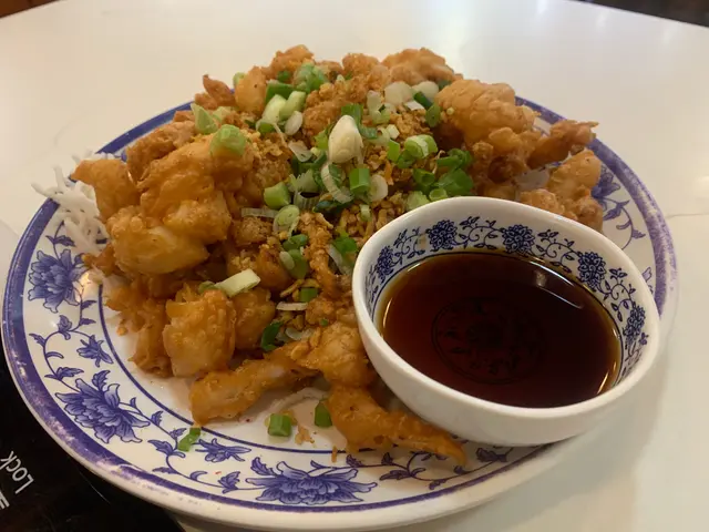 椒鹽鮮魷:魷魚肉質鮮嫩彈牙,椒鹽的香味使整道菜更加開胃,香辣的口感很下飯;