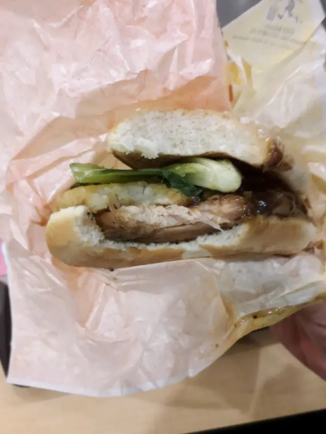 相反,「板燒雞腿包」裡面的味道雖然也有辣味,但是「板燒雞腿包」裡面的辣味,就沒有「黃金脆薯雞堡」裡面的燒烤醬辣味那麼強烈,因為「板燒雞腿包」裡面的醬汁也有甜味。