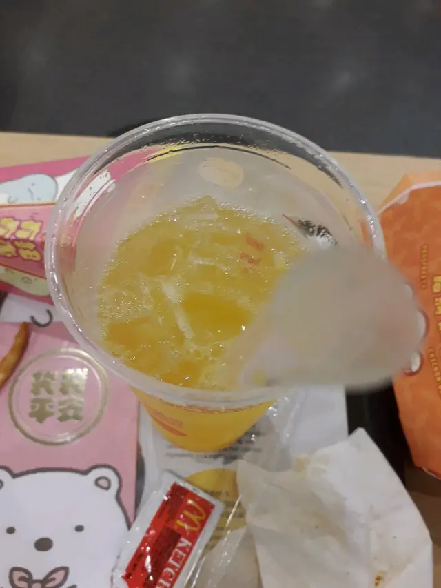 由「將軍澳廣場」分店「麥當勞」廚房製作出來的「熱情果梳打」實際製成品,「熱情果梳打」裡面的雜果味道相對比較酸,沒有我上次食過感覺那麼甜。