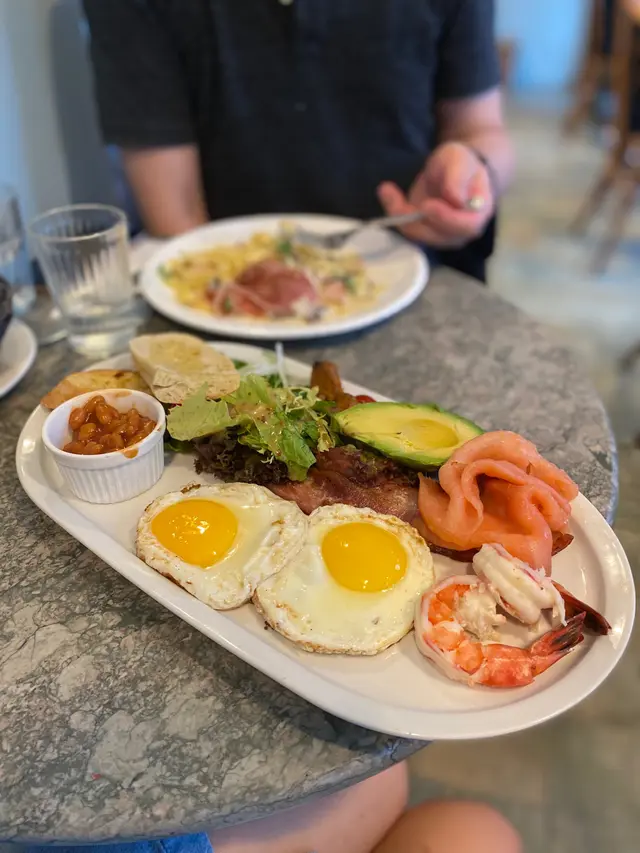 海鮮顧名思義就係有蝦同三文魚 雖然係白烚蝦但都新鮮彈牙‼️😳仲有兩隻脆邊太陽蛋🍳半個牛油果🥑沙律🥗煙肉🥓焗豆 好豐富😍