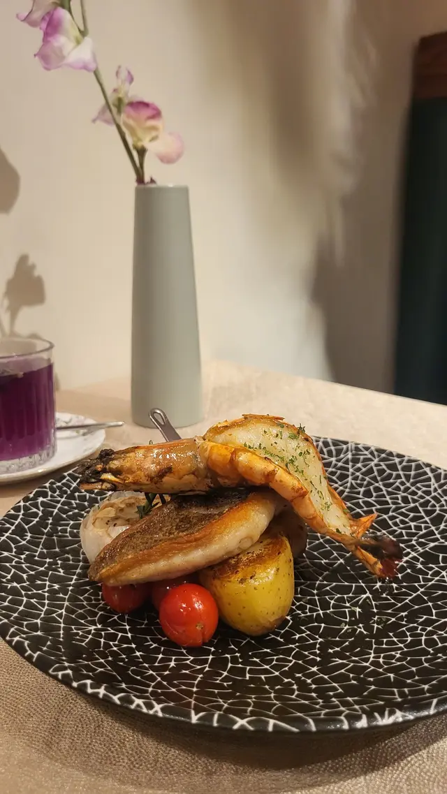 🐟香煎星斑柳拼老虎大蝦配柚子醬油 ~ 星斑外脆內嫩,老虎蝦肉質爽彈又鮮甜,柚子醬油味道清新!
