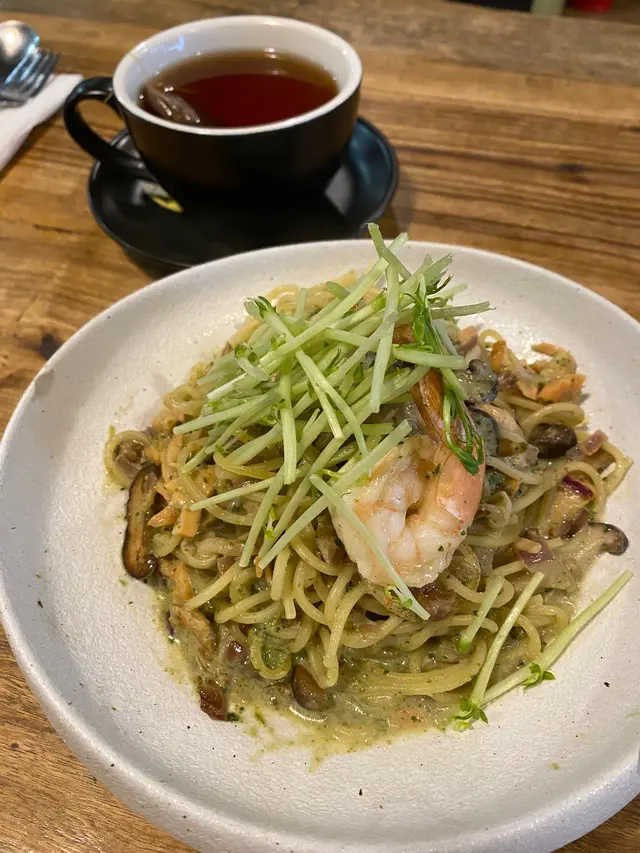 即點即製的關係,大約等了十至十五分鐘菠菜忌廉汁煙三文魚大蝦意大利粉($68)上菜了,熱騰騰的樣子幾吸引。