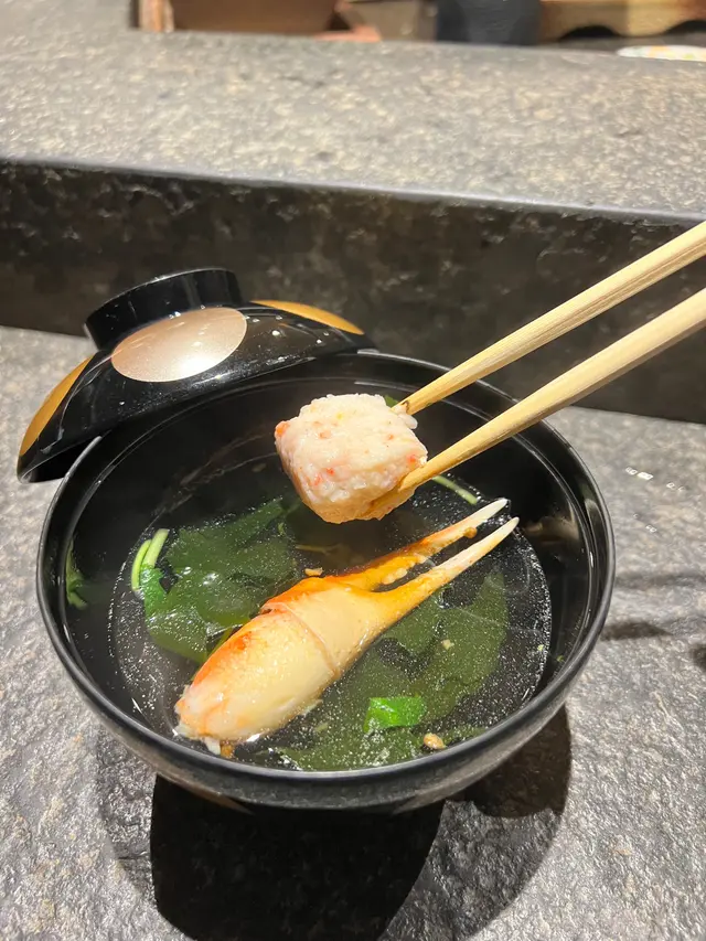 分別有七色米通炸三文魚、鹽焗銀杏、柚子蘿蔔、時令秋刀魚、炸蓮藕片和松葉蟹豆腐🫶🏻