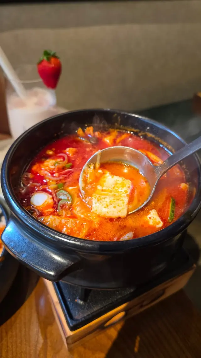 湯底香辣味有層次🔥,加咗拉絲芝士,味道更加濃郁。豆腐滑溜溜、明太子好新鮮,好啱呢個天氣食,飲一啖湯成個人都暖晒。