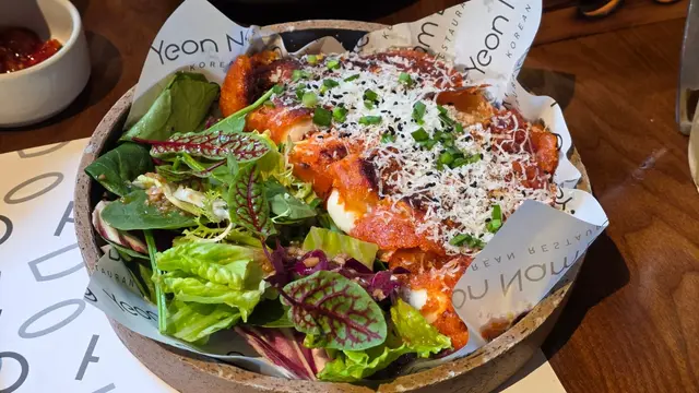 呢個真係全場最驚喜嘅菜式!外層香脆,入面軟糯又拉絲🧀~泡菜酸辣同芝士香味融合得啱啱好,入口香氣爆發🤤!上面仲有芝士粉、蔥花點綴,賣相超吸引,份量又足~唔誇張,呢個一定要叫!