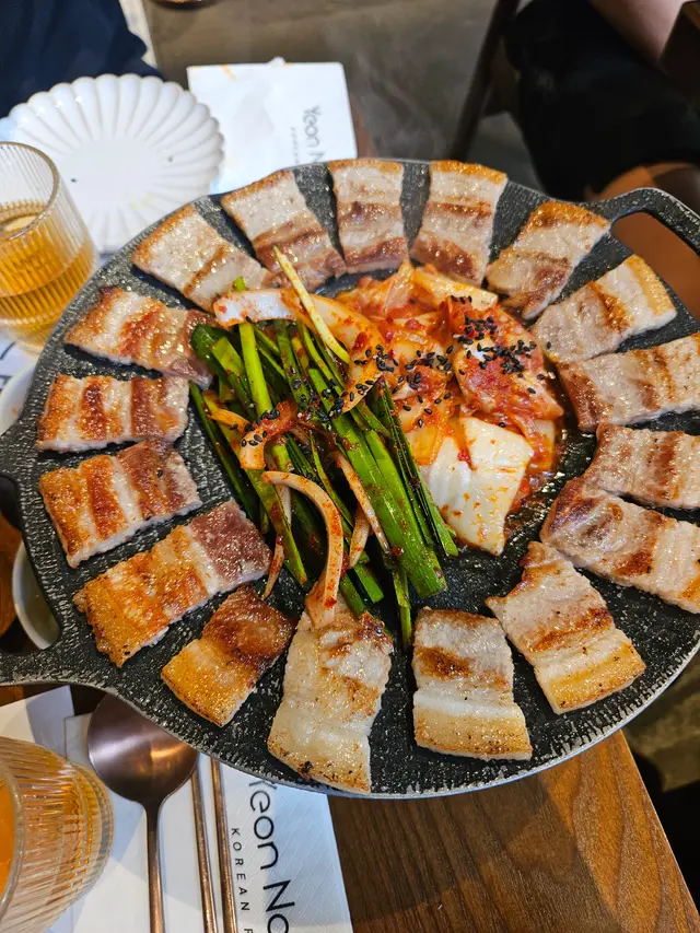 呢個一上台真係相機食先~每塊肉排成圈擺喺鐵板上,中間放晒泡菜同蔥絲🌶️。肉煎得啱啱好,外脆內嫩、油脂香噴噴😋,配埋泡菜一齊食超夾,鹹香帶辣,真係越食越停唔到口~