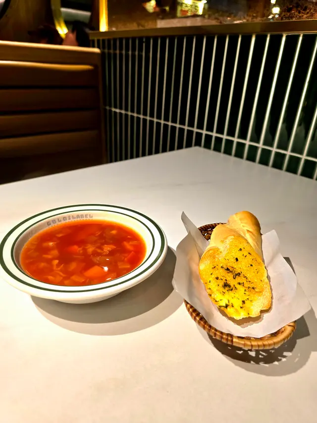 餐跟羅宋湯配蒜蓉包、三文魚沙律