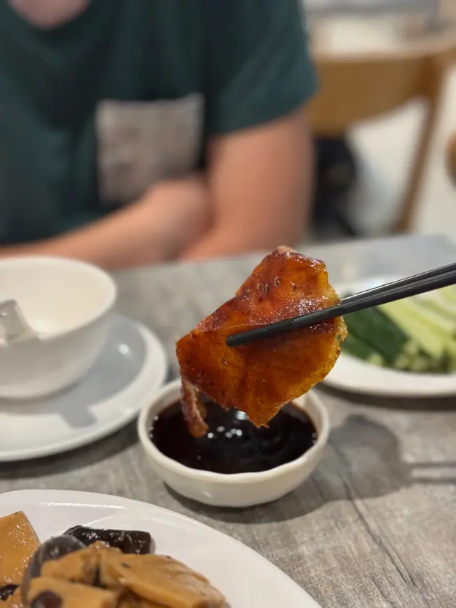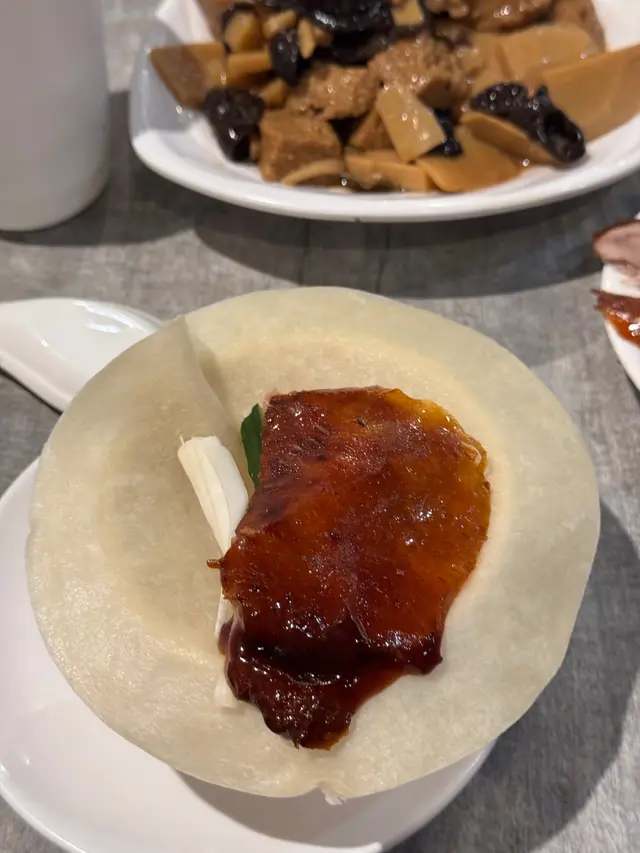片皮鴨半隻:份量極多,鴨皮香脆可口,油脂溢出,蘸上乳豬甜醬加大蔥青瓜,解膩之餘,齒夾留香,麼麼模大約有20塊,熱辣辣,即使沒有隔油紙都沒有黏在一起,好功師傅功架,有肉的部分可以食出鴨香,好味。