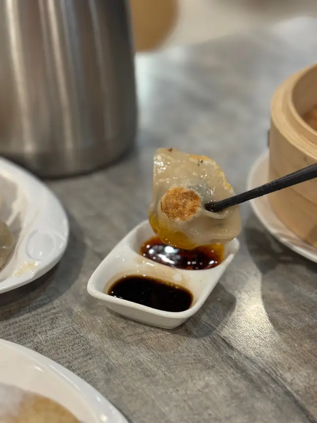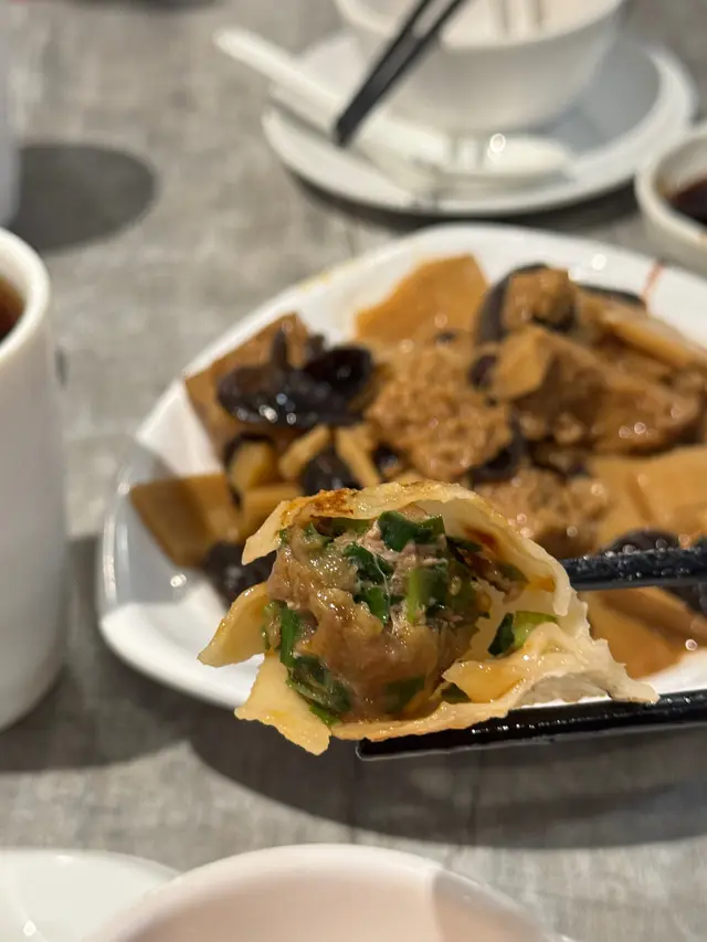 韭菜豬肉餃子🥟(煎):皮偏厚,彈性一般,但又未好到好冧。 韭菜豬肉餃子餡料唔大,韭菜味有,肉餡因為唔大偏削,都是一口一隻,有誠意提供醋同辣油。