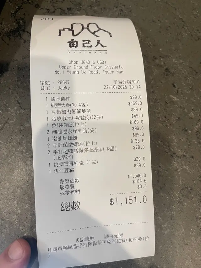 荃灣新派潮州菜 Cowboy 2023等級32025-10-30257 瀏覽 關注 今天晚上,我和太太到新式招牌潮粵菜+手工點心的「自己人」用餐,真係好開心!餐廳位於荃灣楊屋道1號荃新天地UG樓UG43&81號舖,環境舒適,讓人一進去就有食慾。我點了滷水鵝件,味道香濃,肉質滑嫩。接著是椒鹽大鮑魚,香脆可口,四隻都吃得津津有味。豆漿蟹肉蕃薯葉苗也很特別,清新之餘,蟹肉更是鮮甜。金魚戲水的湯蝦餃一口咬下,餡料豐富,真係令人驚喜!還有魚翅撈飯,飯粒吸收了鮑汁,味道一流。潮汕滷水炸乳鴿金黃香脆,搭配潮汕炸蠔餅,讓我忍唔住一口接一口。最後來碗羊肚菌燉螺頭,香濃滋補,完美收尾。飲品方面,我選擇了手打老鹽話梅檸檬綠茶,清爽解膩,甜度剛好。食完之後,心情都好好,期待下次再來!#自己人 #荃灣楊屋道1號荃新天地UG樓UG43&81號舖以上食評乃用戶個人意見 , 並不代表OpenRice之觀點。讚好分享荃灣新派潮州菜 自己人 (荃新天地) https://s.openrice.com/QrbT0im1V00檢舉 張貼 評分5味道5環境5服務5衛生5抵食用餐途徑堂食