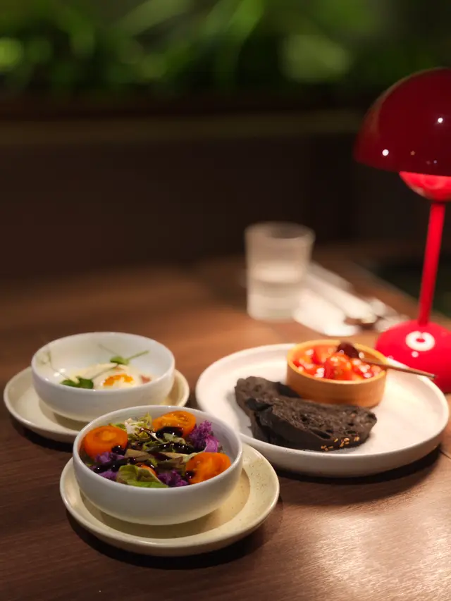 前菜: 小蕃茄配竹炭麵包 / 田園沙律 / 三文魚子溫泉蛋