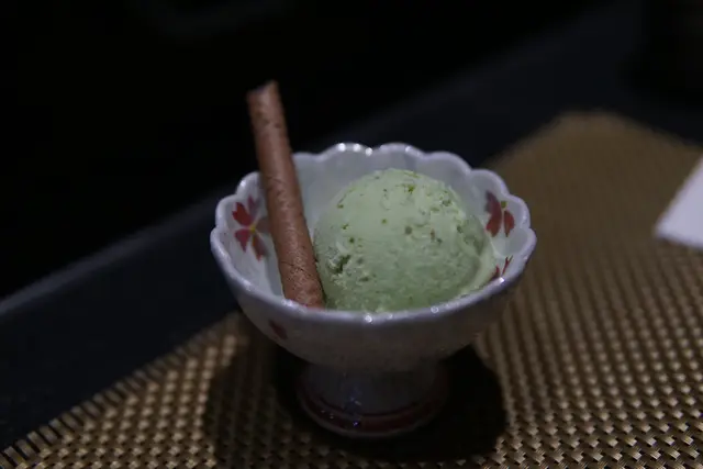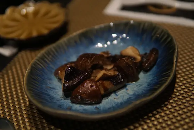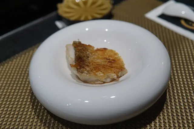 立鱗燒的外表金黃酥脆,內部保持著魚肉的嫩滑。做法令甘雕魚的口感更加豐富,配上濃郁的鮟鱇魚肝汁,它的滑順質地與甘雕魚的燒烤口感形成了完美的搭配。