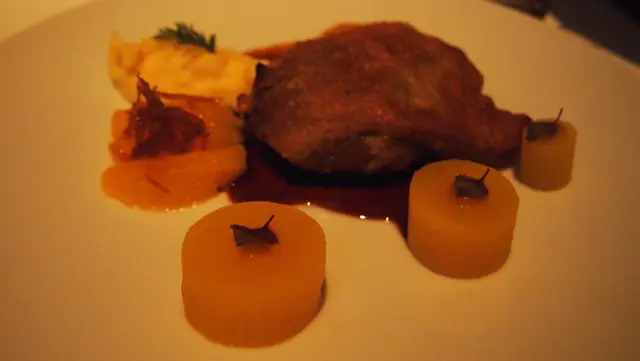 油㓎鴨腿配玉米蓉、黃長薑蘿蔔、香橙果醬及鴨肉汁