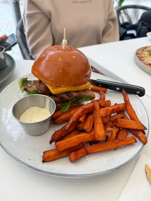 這道漢堡的份量非常足夠,雞扒厚實卻不失嫩滑,口感極佳。白味噌醬的鹹度恰到好處,與甜甜的玉子燒形成了完美的平衡,甜鹹交織的味道讓人一口接一口,完全停不下來。搭配的炸番薯條外脆內軟,帶有天然的甜味,為整道菜增添了更多的層次感。