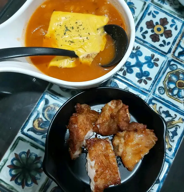 先講下個蕃茄湯,因為係呢度主打所以我對佢都有大期望~佢本質上好似羅宋湯,湯底偏向濃郁稠身,蕃茄味道甜酸適中,蕃茄蓉明顯食出有好多🍅,仲有啲洋蔥片同紅蘿蔔粒咁~上面塊芝士就係普通既片裝芝士加少少香草上面🧀,同我預期都基本上一樣,正正常常咁,但呢個湯底配螺絲粉就認真好夾👍🍅❤!