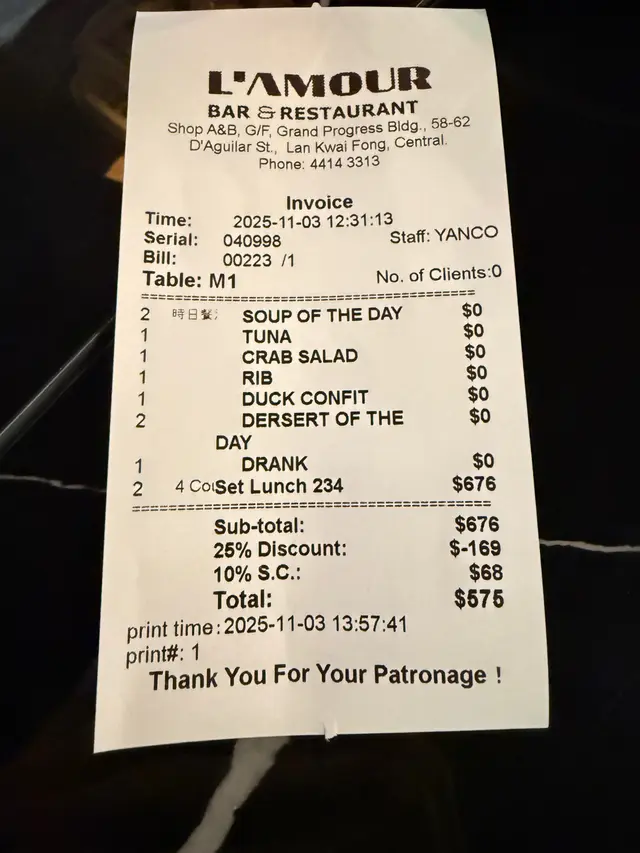 蘭桂坊隱世法日浪漫餐廳!水晶琴+巨型玫瑰打卡一流💖 catbaby1123等級42025-11-04 關注 今日同friend去咗中環L'amour食lunch,真係靚到尖叫!餐廳藏身蘭桂坊協興大廈,推門即刻進入咗個童話世界🎠 絲絨紅心座椅、滿天垂吊水晶燈,真係好似愛麗絲夢遊仙境咁奇幻!最吸睛係部會自己彈奏嘅水晶三角琴🎹同埋牆身綻放嘅巨型玫瑰藝術裝置,每個角落都係打卡位📸✨$300+四道菜午餐超抵食✨▫️頭盤:吞拿魚沙律好新鮮,魚子醬蟹肉沙律鮮味爆棚🦀▫️餐湯:南瓜湯綿密順口,飲到淡淡南瓜甜香🎃▫️主菜:油封鴨髀外皮脆脆哋,肉質軟淋入味!肉眼扒煎得啱啱好,肉汁鎖得住🐮▫️甜品:芝士蛋糕奶香濃郁,完美收尾🍰▫️餐茶:熱奶茶茶味夠醇,唔會太澀☕成個體驗真係滿分💯 由環境到食物都感受到餐廳嘅用心,浪漫氣氛絕對係情侶約會首選💑 平時食法國菜閒閒地過千,呢度$300幾真係性價比超高!下次紀念日一定要再嚟encore~1以上食評乃用戶個人意見 , 並不代表OpenRice之觀點。讚好分享蘭桂坊隱世法日浪漫餐廳!水晶琴+巨型玫瑰打卡一流💖 L'AMOUR https://s.openrice.com/QrbT0CX5V00檢舉 張貼 評分5味道5環境4服務5衛生5抵食用餐途徑堂食