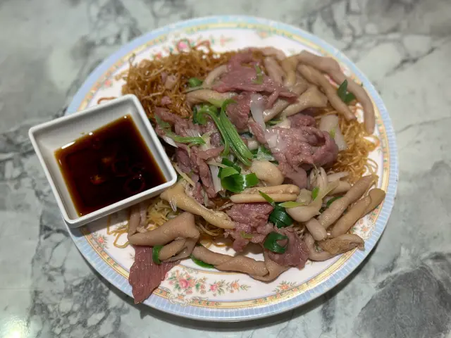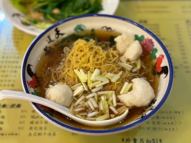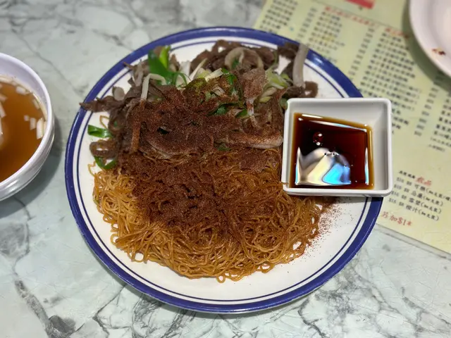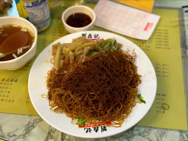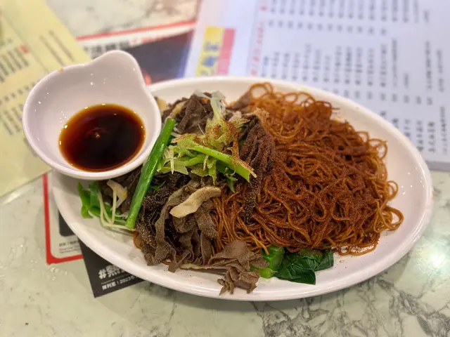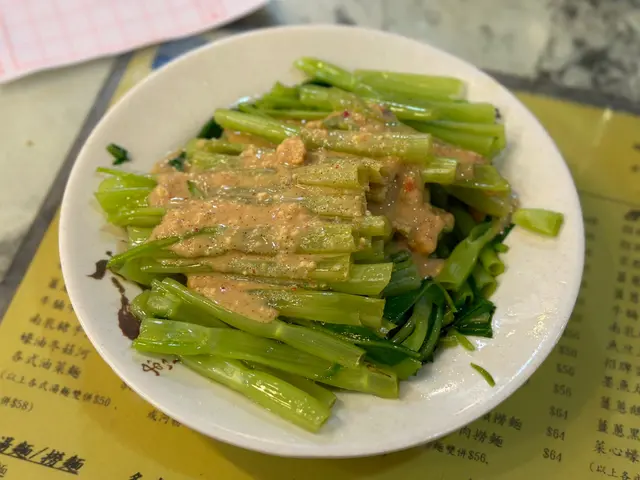 🍜虾子捞面,点单最多的是双拼或三拼的虾子捞面。细细的竹升面,捞面油润弹牙。虾子品质一般,量给得非常足。黑牛百叶,未漂白的千层肚,作为经常吃毛肚千层肚的川渝人,这黑牛百叶品质可以说非常好,有韧劲又爽口。鹅肠脆嫩,姜葱压住了腥气,也处理了大部分油筋。鲜牛肉片,口感细嫩,会搭配一个蘸碟。面底也有搭配青菜,捞面配的汤里也是满满的虾子。汤面,只吃过墨鱼丸鲜虾云吞面。云吞没什么卖相,不过内容扎实,虾仁新鲜,也有虾籽,味道正常。墨鱼丸不是圆形,每颗丸子都有一个缺口。能吃出墨鱼肉,但墨鱼味不浓郁。蚝油菜心,蔬菜处理得很干净,口感清甜,腐乳通菜用的辣腐乳,蔬菜分量很足。可能生活在深水埗的多是从事底层劳动的老百姓,分量很足,价格实惠,良心店家。