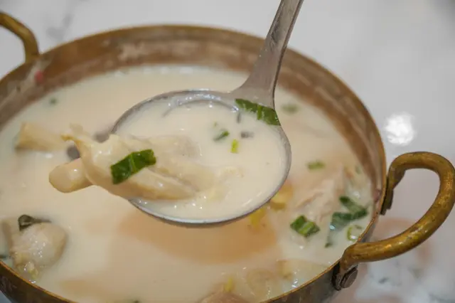 湯內也有不少雞肉和菇菌等,十分豐富。