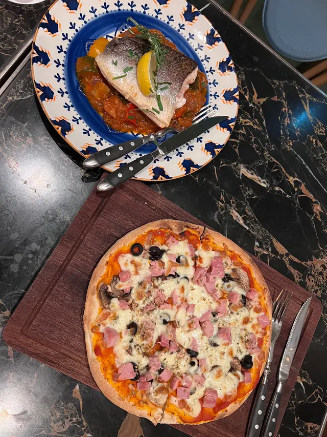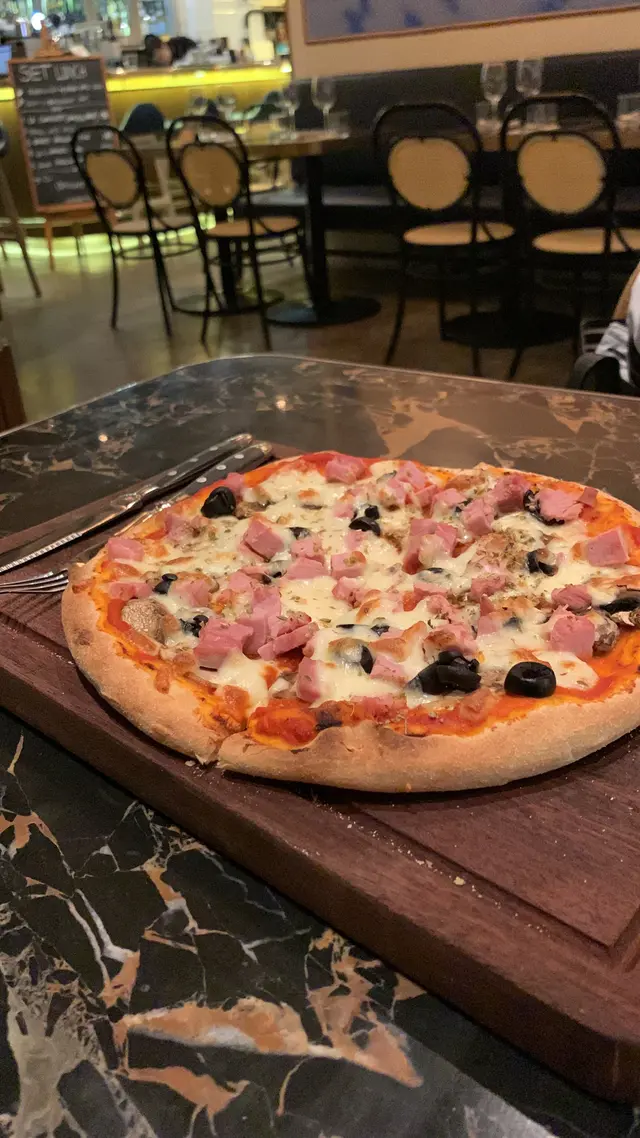配料豐富:火腿、蘑菇、橄欖、蕃茄醬、水牛芝士,口感酥脆有嚼勁,而且內裏的芝士份量十足,撕開薄餅的時候,芝士可以拉絲。