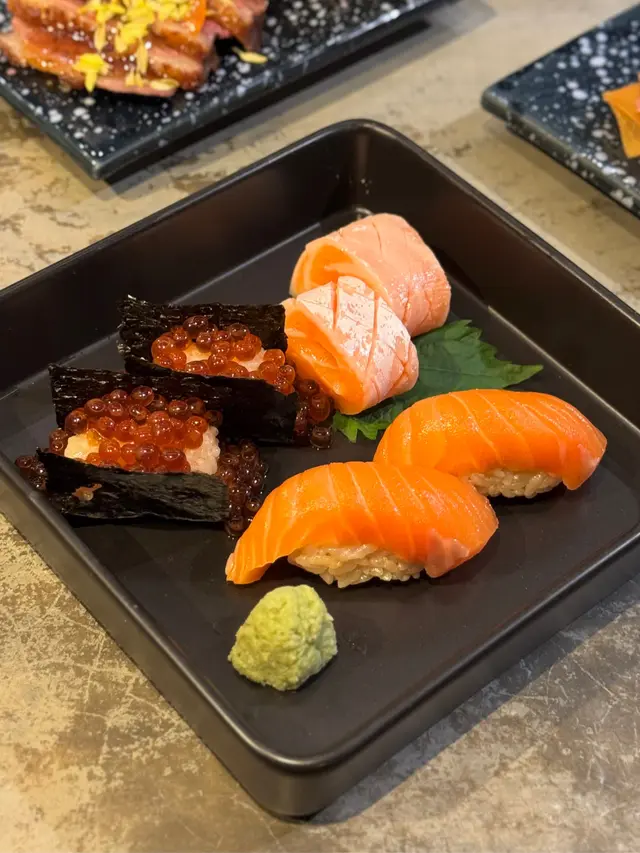 三文魚壽司充滿香甜美味,而三文魚刺身嘅油脂咁更加明顯,一大塊入口好滿足!