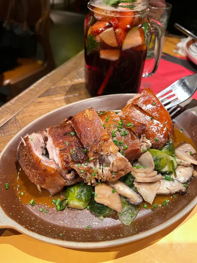 Crispy slow-roasted suckling pig with Brussels sprouts and mushrooms