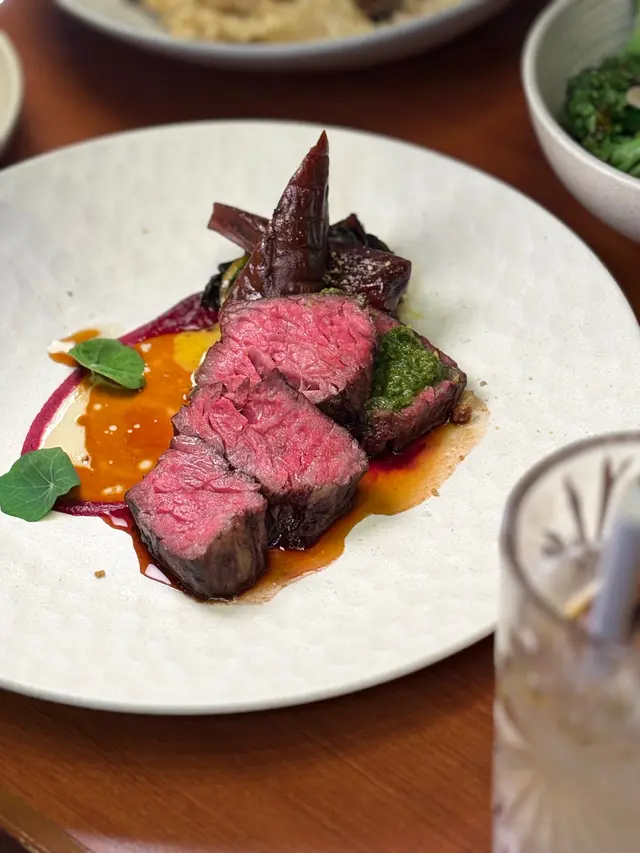 油花均勻的和牛搭配咖啡油獨特香氣,紅桑子紅菜頭蓉平衡油脂感