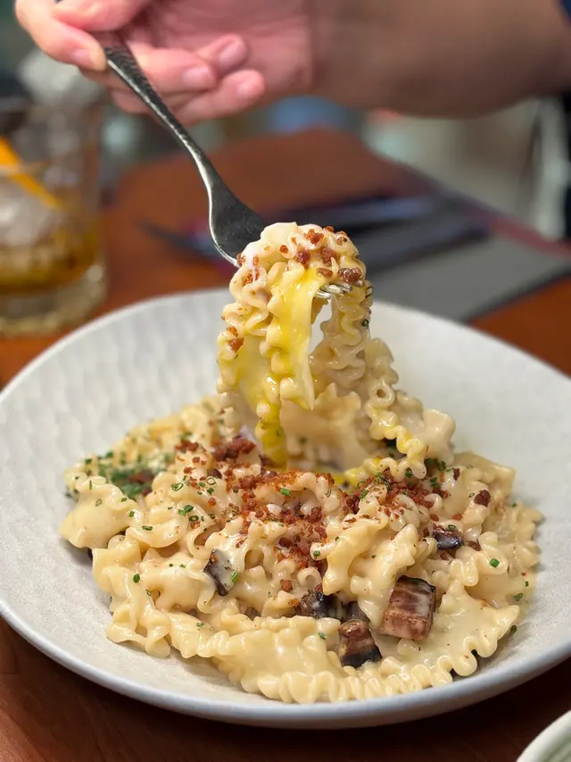 波浪麵掛滿流心蛋黃跟巴馬臣芝士,意式煙肉🥓切成方塊勁酥脆!鹹香誘人,口感濃郁滿足