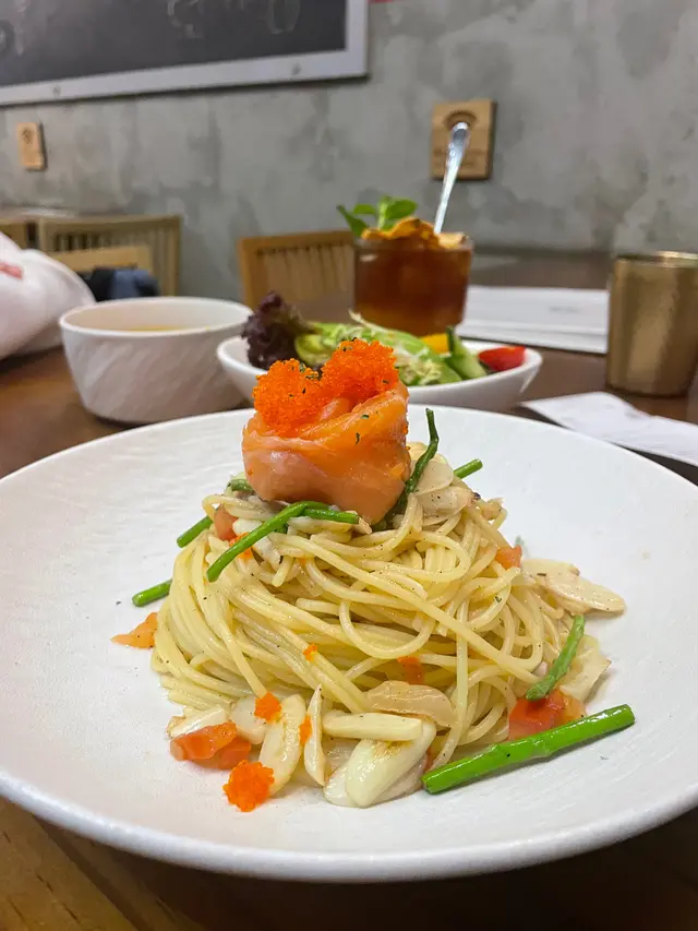 午餐時間梗係要試佢哋嘅招牌!韓式辣汁海鮮意粉配煙三文魚 真係勁有驚喜!🌶️ 韓式辣汁調得好惹味,帶少少甜味,完全唔會死辣,意粉掛汁一流!上面仲有大片煙三文魚,味道豐富!另一款蟹籽•蘆筍•煙三文魚拌香蒜橄欖油意粉 就走清新路線,香蒜味濃郁,蟹籽卜卜脆,夠晒開胃!🤤