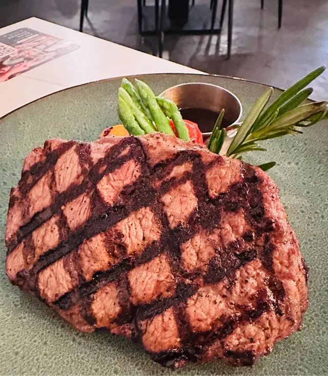 牛扒肉質緊實且富有光澤,邊緣微微焦脆,切開後內部呈現完美的粉紅色(Medium熟度)。一口咬下,肉汁瞬間在口中爆發,濃郁的肉香和炭燒味非常突出。