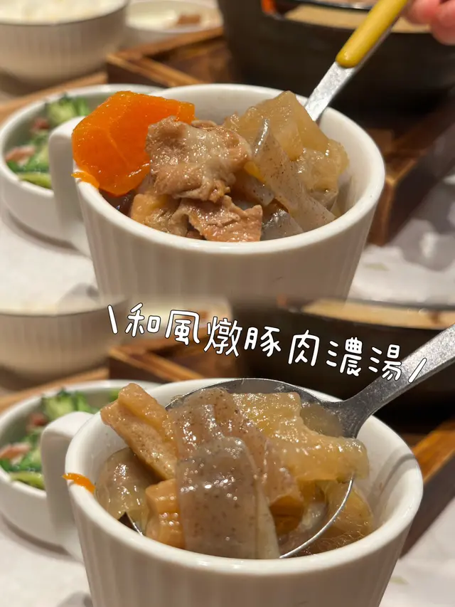 肥牛肉片搭配香醇的壽喜燒汁,甜中帶鹹,口感層次豐富~和風燉豚肉濃湯真係好足料,有豚肉、蒟蒻同埋蘿蔔等等嘅食材喺入面,湯底濃郁,令人非常開胃❤️