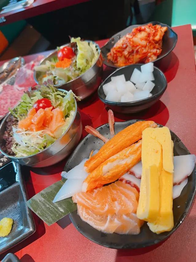 有兩款已經預先加入麻醬的三文魚同蟹子沙律🥗有韓式前菜 喜歡酸蘿蔔夠開胃解膩 也有七款刺身供應🍣甜蝦同北寄貝都好鮮甜