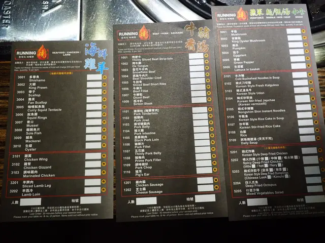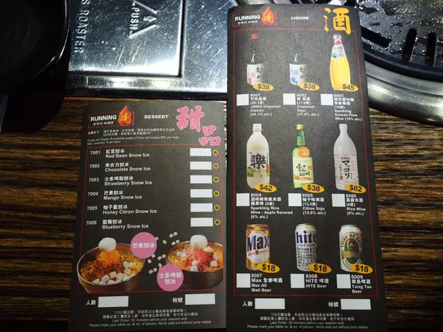 餐單可選海鮮、牛肉、豬肉、雞、羊、蔬菜、年糕/麵/飯類、小食 (只限晚市供應)和甜品。還不少款式的真露、米酒和啤酒等,但不設任飲,價錢由最平的啤酒$18-$62不等。