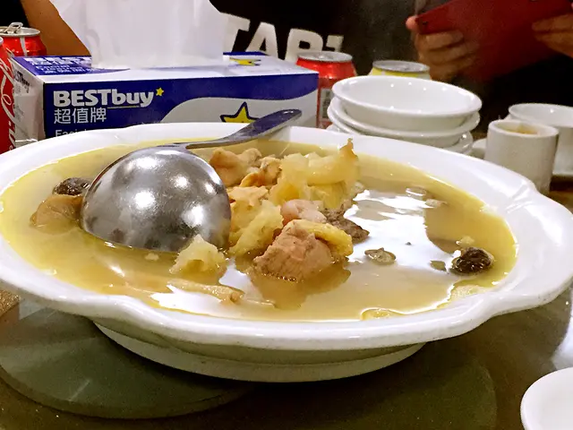 早前收到久未露面的好友邀請,相約月後一同試私房菜。這種有誠意的大伙兒包場飯局,絕對歡迎之至。《龍泉》隱身於尖沙咀舊樓,欠缺裝潢,空間感亦欠奉,充其量是間一房一廳的舊式單位,放下四張大圓枱而已。實難以想像在如此簡陋的環境下大魚大肉,享受鮑參翅肚、蝦兵蟹將。 先來一碗<花膠雞脚燉螺頭湯>作頭砲!用料十足,花膠、雞腳、花菇盡入眼簾,未喝其湯已被臣服!味道也令人心悅誠服。