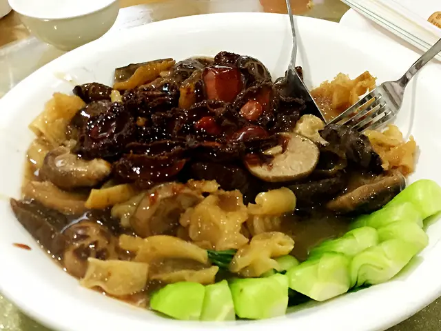 若嫌'湯渣'枯燥乏味,接著上桌的<原只鮑魚扣山珍海味 > 入味鮑魚花膠花菇,一定能填補空虛。