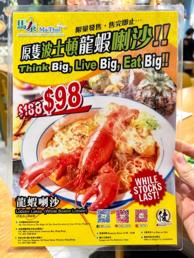 超值泰國菜 必食原隻波士頓龍蝦喇沙$98 foodiez.la等級42025-08-03350 瀏覽 關注 友人說吃到性價比最高的泰菜,不用百元吃到原隻龍蝦喇沙,而且不是限量優惠,人人都可以吃到,決定試試,店鋪播住泰文歌,牆上是泰國街頭2原隻波士頓龍蝦喇沙$98巨型波士頓龍蝦,可以看旁邊的雞蛋作比例,喇沙湯濃郁帶辣味,椰奶香氣撲鼻,傳統摻摻是油面加米粉,帶來兩種口感,後來看到每台都點了一碗,必食推介泰式無骨海南雞飯 $82黃油雞肉嫩滑,完全無骨,沾酸辣醬吃一流,配油飯和羅白雞湯,雞湯味道清甜招牌泰式冬陰功湯(細) $82酸辣惹味,帶東南亞香料和椰奶的香氣,裡面有大蝦和蜆等海鮮,相當足料11341以上食評乃用戶個人意見 , 並不代表OpenRice之觀點。讚好分享超值泰國菜 必食原隻波士頓龍蝦喇沙$98 馬泰 https://s.openrice.com/QrbT0jiHT00檢舉 張貼 評分5味道5環境5服務5衛生5抵食用餐途徑堂食
