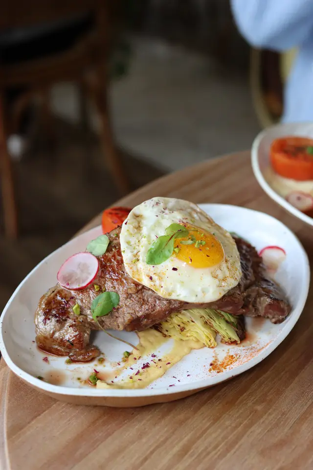 配菜有一顆半熟太陽蛋、燒野菜和醬汁。