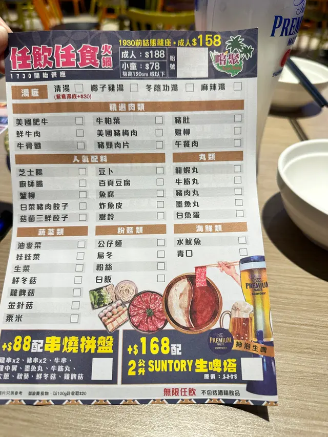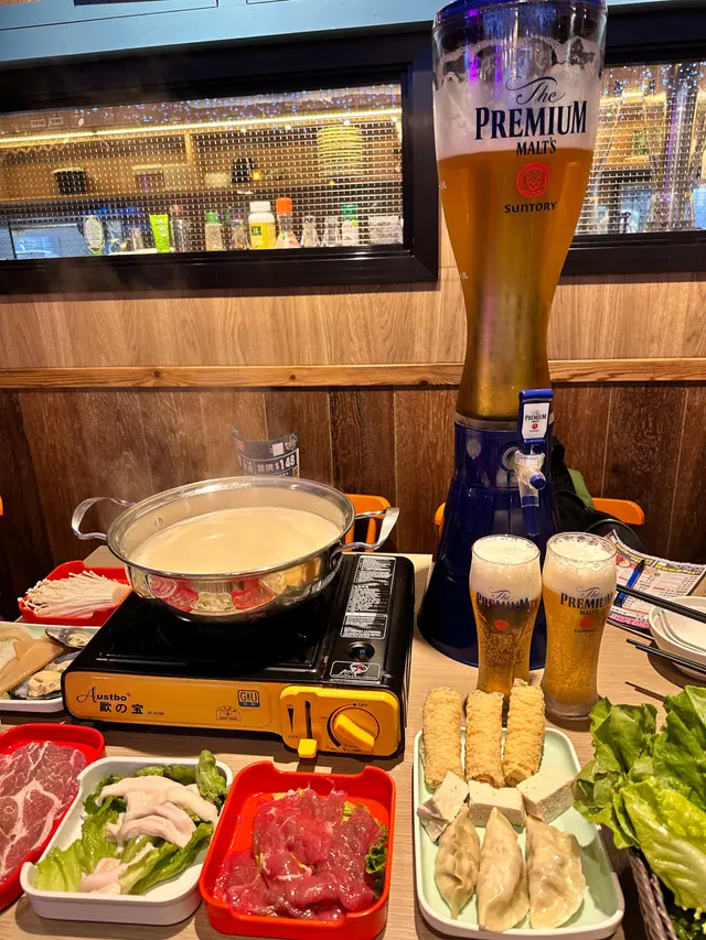 呢間餐廳推出嘅任飲任食火鍋 + 串燒拼盤真係超值!加$88就可以享受到多款嘅串燒拼盤,原價係$148嘅價值。而火鍋方面,佢哋提供咗好多選擇,包括美國肥牛、鮮牛肉、牛骨髓、牛柏葉、美國豬梅肉、菇菌三鮮餃子、百頁豆腐同埋響鈴等等,令人目不暇給。蔬菜方面亦有油麥菜同生菜,可以加入火鍋一齊煮食。