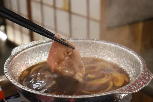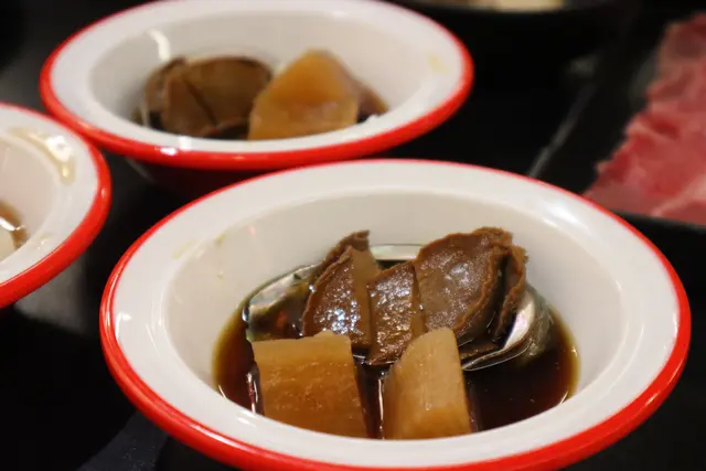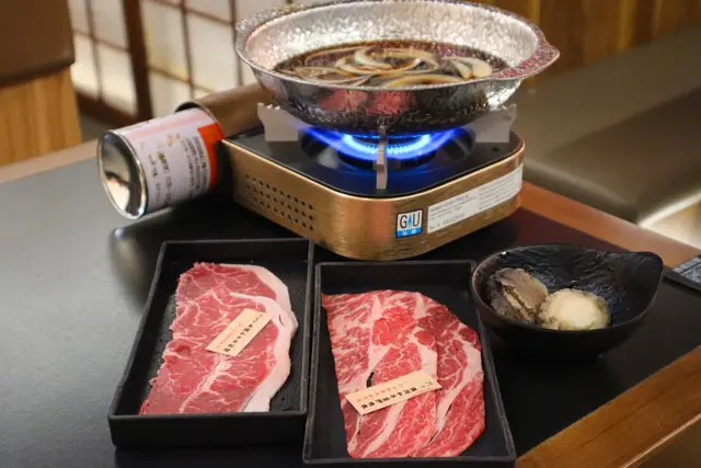 壽喜燒鍋中優質牛肉有兩款:SRF美國和牛牛板腱、M7澳洲和牛肩胛肉眼,前者油香與肉味並重,肉質較幼嫩;後者肉味較重,個人偏好前者。而壽喜燒鍋湯底甜美。