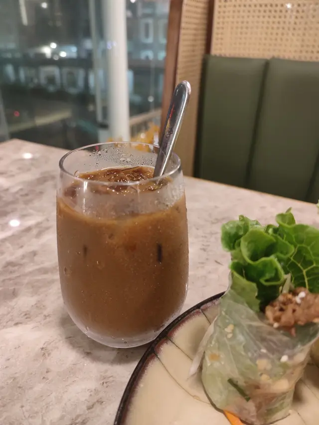 最後一定要說這杯咖啡。越南咖啡一直都很出名,是越南旅遊的常見手信。但這杯現場滴漏的咖啡,更是比有包裝的那種好喝幾倍!越南黑咖啡不是加牛奶or淡奶,而是——煉乳!首先是底部放一坨煉乳,上面是黑咖啡。我先喝了幾口咖啡,感覺比我平時喝的齋啡要濃,其實直接喝也是可以的。如果不想喝這麽重口的齋啡,就把底部的煉乳攪拌均勻,就是一杯越南特色冰咖啡了!既有香濃的咖啡味,又不會太苦澀,煉乳也沒有搶占甜味。我將永遠擁護越南咖啡🤣🤣