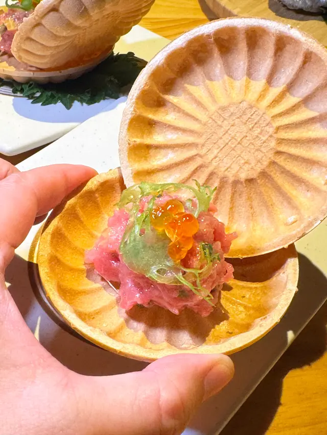 用香脆的最中餅配上吞拿魚腩他他,外層香脆吞拿魚蓉魚油豐富,入口甘香肥美,再配上三文魚子更加鮮味,而且外脆內軟口感豐富