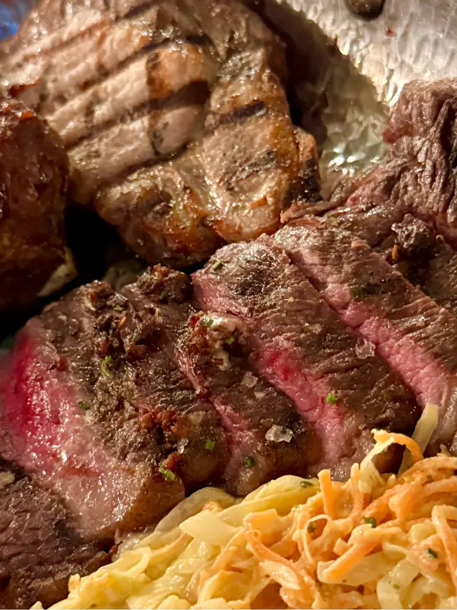 燒烤拼盤包羅萬有豬牛雞樣樣齊,啱晒食肉獸。穀飼牛臀肉揀咗七成熟肉質鮮嫩。半隻燒春雞皮脆肉滑。紅燒豬肋肉好腍。豬排厚身有少少乾。香草豬肉肉香腸味道不錯。粗薯條炸得香脆。最正用牛骨髓塗抹酸種麵包,令酸種麵包增添牛脂香味。