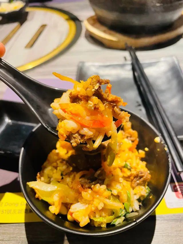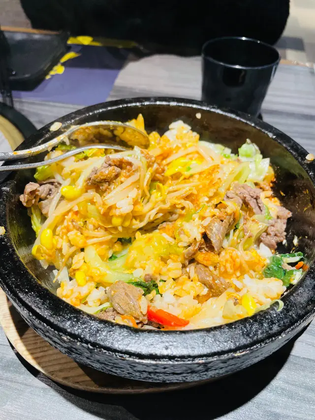 有豬🐷、牛🐮、雞🐔3款揀,頭大同朋友揀左牛,石頭鍋飯除左主角牛肉,仲有芽菜、白菜仔、生菜🥬、蘿蔔絲同蛋黃🥚,店員勁好服務幫我地加埋碟辣醬撈勻,多數出面餐廳都係要自己撈🤪