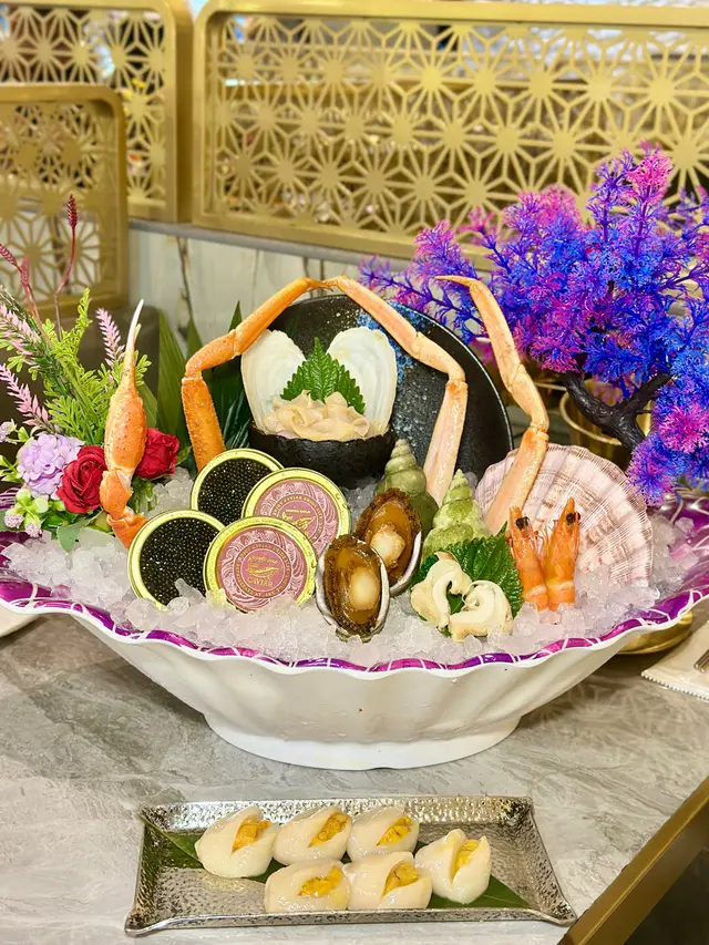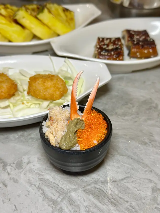極品海鮮拼盤同樣吸引,擺盤美美的。松葉蟹腳啖啖肉又鮮甜,每人有一盒魚子,鹹香十足。升級凍海鮮都係任食,要encore~