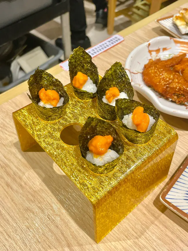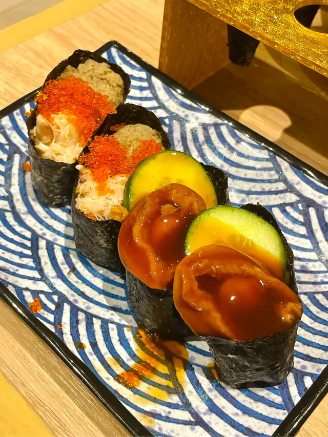 軍艦(跟餐$0),包括有三色蟹軍艦、鮑魚仔軍艦 ,三色蟹軍艦內有蟹肉、蟹膏、蟹籽,食落三重鮮味享受。