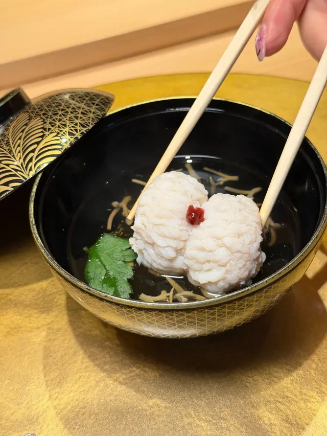 🥣 鱧魚清湯:京都名物!信菜同蓮葉嫩芽被晶瑩啫喱包裹,湯頭清澈鮮甜,飲完成個胃暖笠笠~