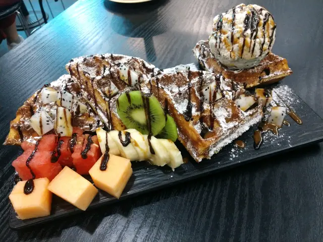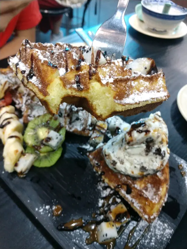 鮮雜果窩夫$68, 非常推介窩夫質感,裏面鬆軟得像蛋糕的軟綿綿,見到裏面氣泡均勻綿密的,而外面焗得脆脆的,口感非常好!而且有四大片伴窩夫, 很夠飽啊!拌著各款鮮雜果,還有自選的雪糕球,我們選了曲奇味雪糕,一大球,夠凍不會太快溶,很滿意!絕對能滿足甜品控的口腹之慾,這個價錢,這種口感,覺得值回票價。