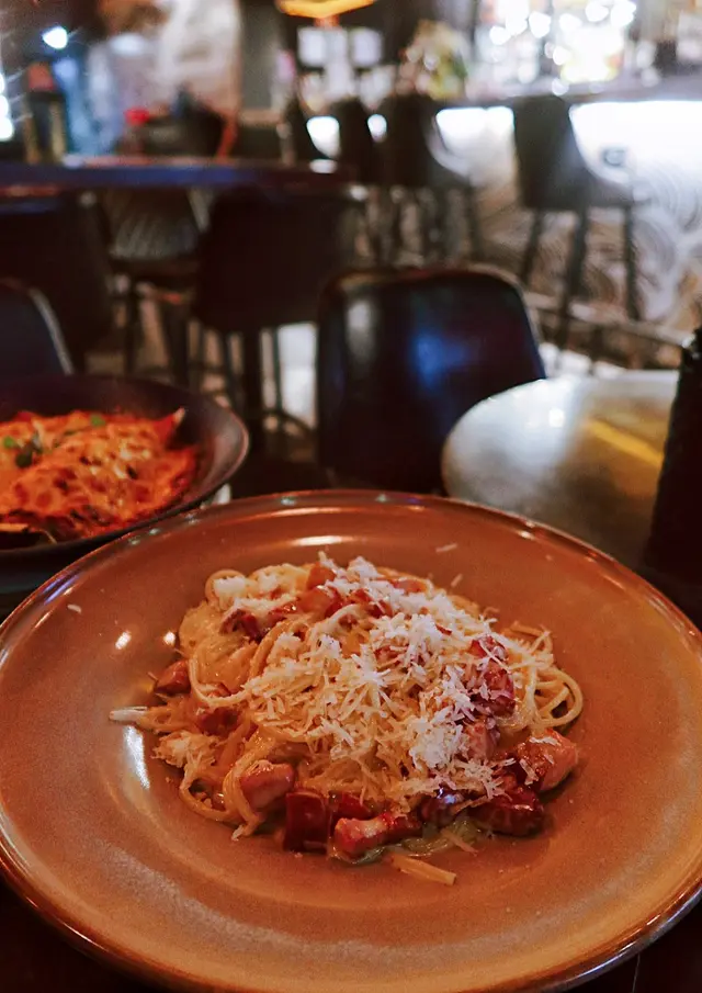 🍝Spaghetti Carbonara(Hk$168): 奶油醬汁濃郁creamy,煙燻培根鹹香,與蛋汁和芝士融合得恰到好處,麵條軟硬適中
