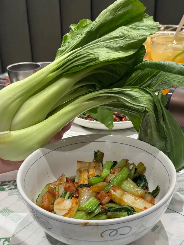 條根白色澤翠綠,口感清爽脆嫩,帶有回甘,用豬油渣爆炒,豬肉嘅香滑與條根白完美融合