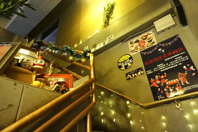 而拾級而上,上到二樓就別有洞天,環境幽暗得嚟,又打咗射燈,加深色木系枱椅,好一派居酒屋格局,蠻有深夜食堂嘅氣氛